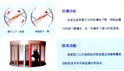 旋转门功能: 旋转门功能有效的保证了建筑物内外环境的隔离,从而大幅度降低了室外环境对室内的影响。该功能包括:锁门、开门位置启动、关门位置启 动、连续旋转、手动旋转。